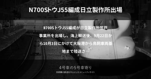 N700SトウJ55編成が日立製作所笠戸事業所を出場し、海上輸送後、9月22日から10月3日にかけて大阪港から鳥飼車両基地まで陸送されました。
